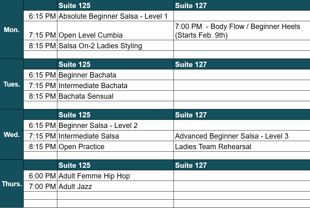 WEEKLY SALSA + BACHATA CLASS SCHEDULE